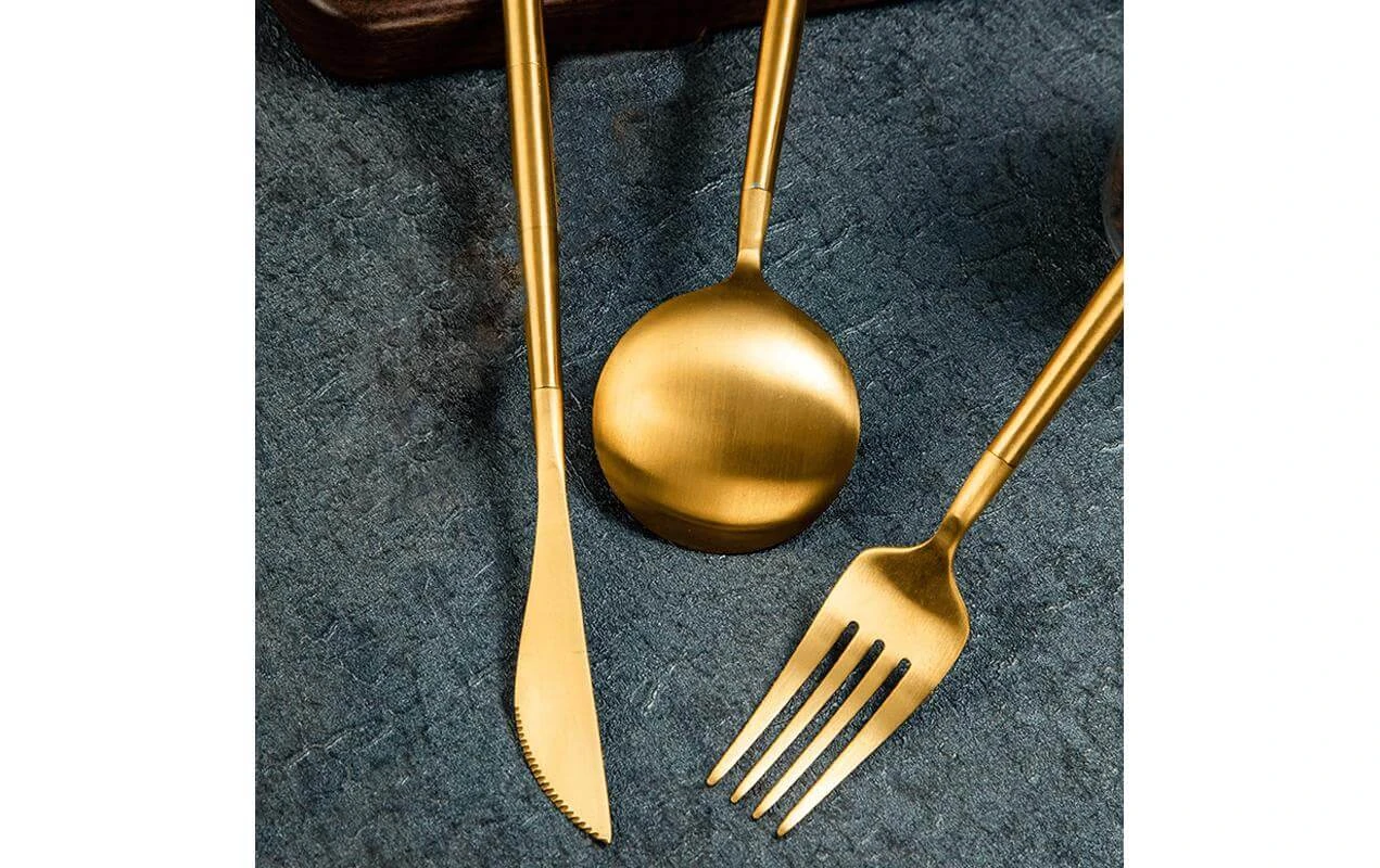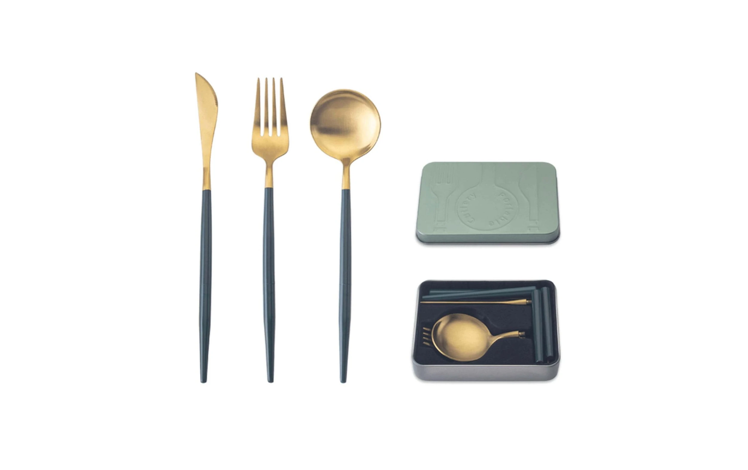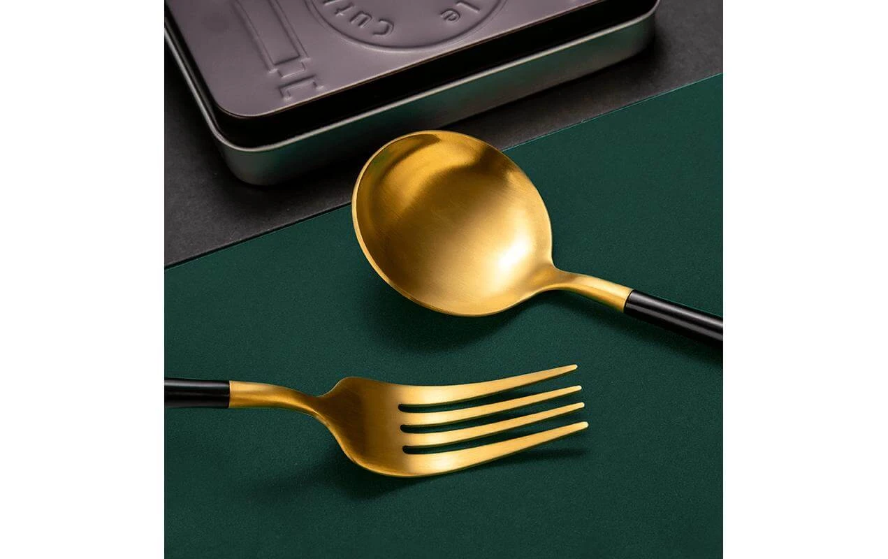 – Couverts prêts à l’emploi dans la couleur Doré/Vert